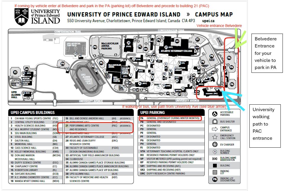 See map below for location of Performing Arts Center (PAC - building 21), best route from University Ave. for walking and public transportation, and best entrance from Belvedere for parking: